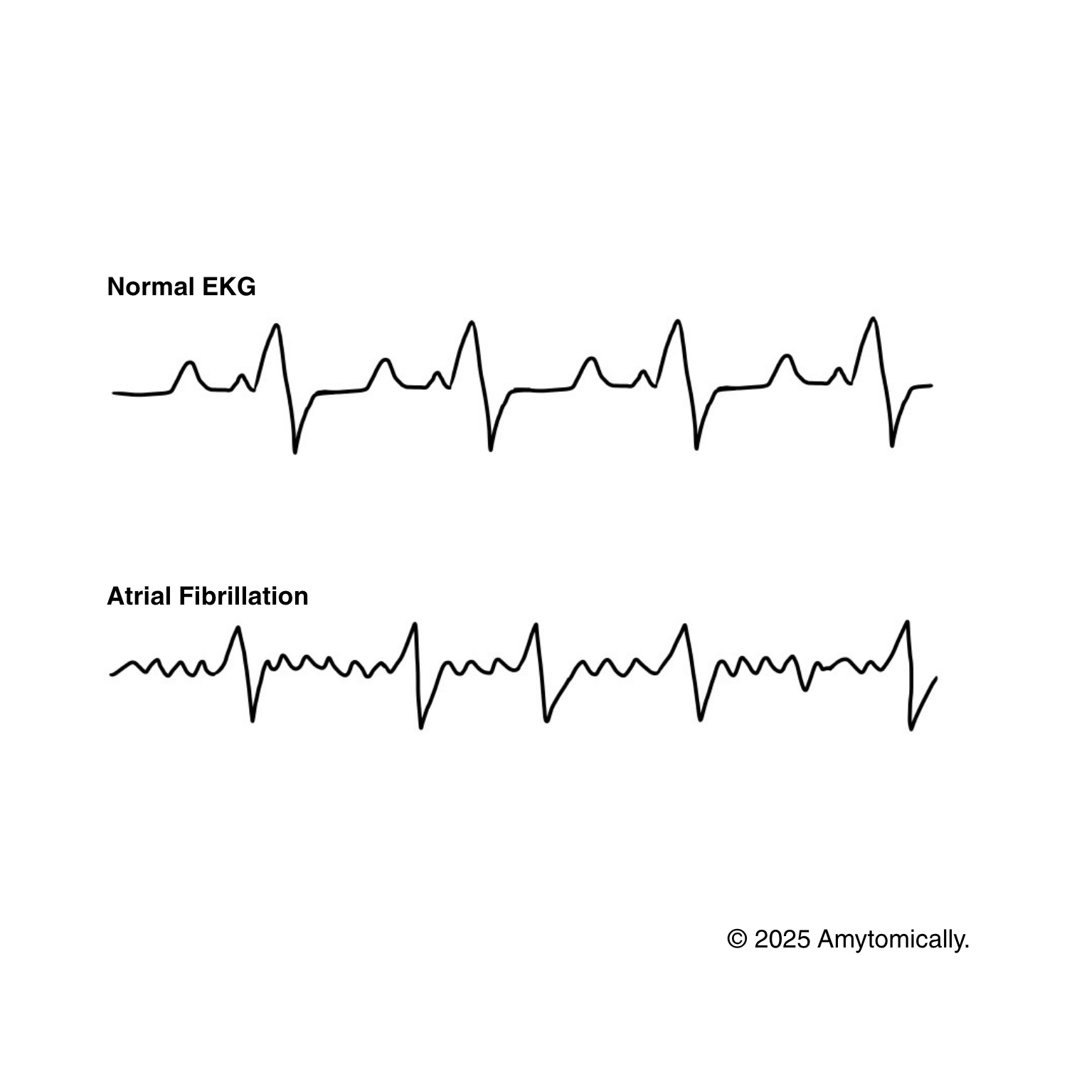 Figure 1 Depiction of a normal EKG waves, as well as the contrasting irregular, and fibrillary/absent nature of AF.