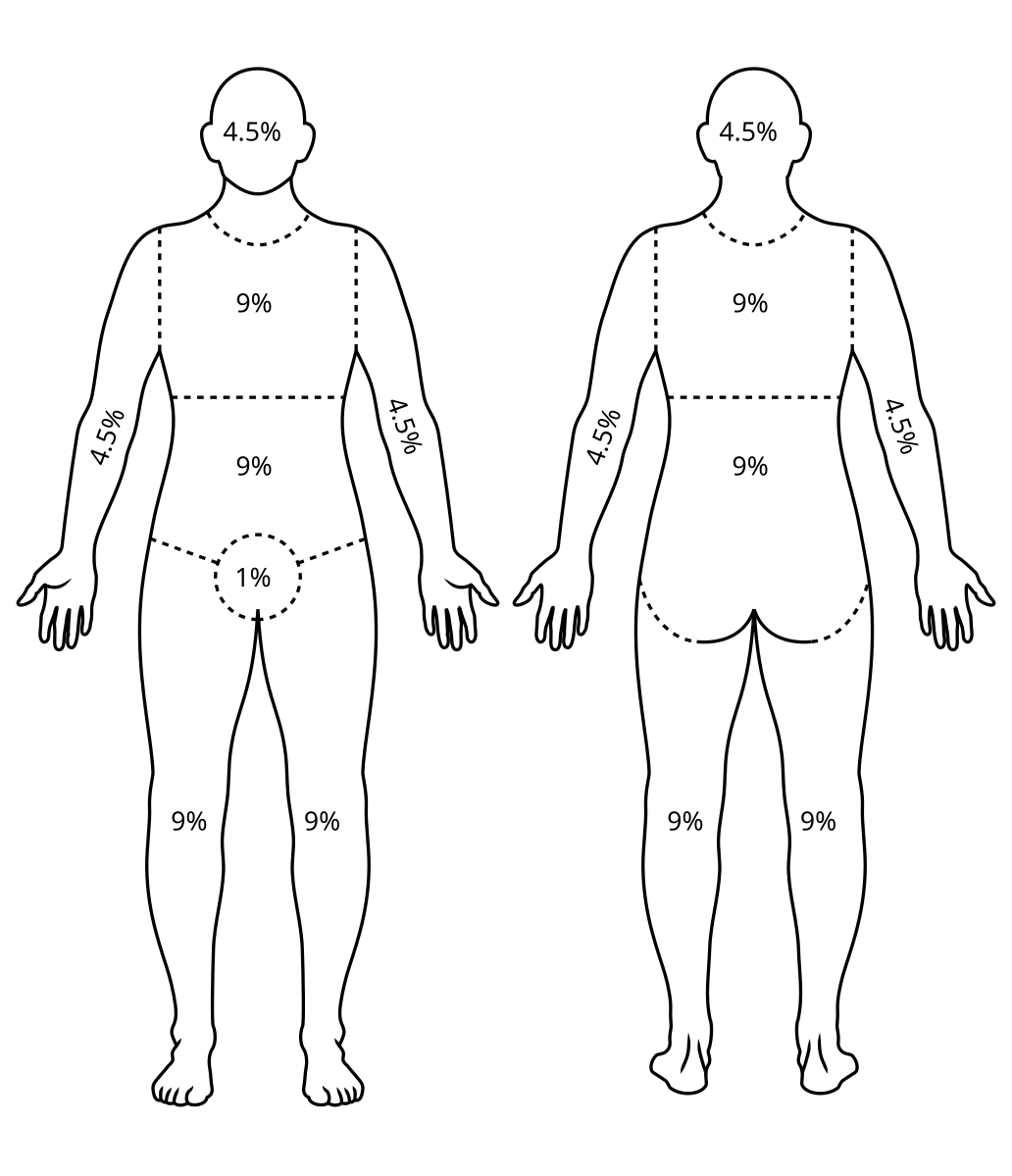 - Rule of 9s: sum affected areas to determine extent of burn (refer to Lund & Browder Chart; i.e., Figure 1)
